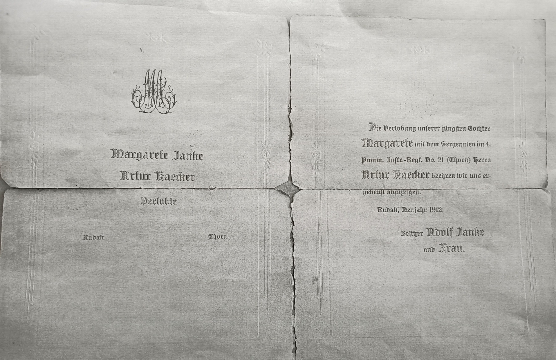 Nasze Muzeum otrzymało od Państwa Ulli i Ralfa Selke z Berlina kopie odnalezionych dokumentów,listów, pocztówek i zdjęć dotyczących byłych mieszkańców Rudaka i Wielkiej Nieszawki koło Torunia. Należały one do rodziny Janke z Rudaka (patrz-zdjęcia). Po Adolphie Janke zachował się album z jego własnymi wierszami, datowany-Wielka Nieszawka 1877). Są również zdjęcia Artura Janke, Alfreda Janke, Hugo Janke i Margarete Janke. Najmłodsza córka Adolpha Janke – Margarete Janke poślubiła w 1912 roku sierżanta 4. Kompanii Pomorskiego Pułku Piechoty Nr 21 (Thorn) Artura Kaeckera (patrz – zawiadomienie o zaręczynach). Margarete urodziła 3 córki: Gerdę-Ruth, Ursulę i Irmtraud Kaecker (patrz-zdjęcie). Dwie z nich wyszły za mąż, jedna za pana Löscha, druga za pana Homburgera lub Hombergera. Jedna z nich mieszkała w Berlinie i w ten sposób te dokumenty trafiły do naszych Przyjaciół z Berlina.