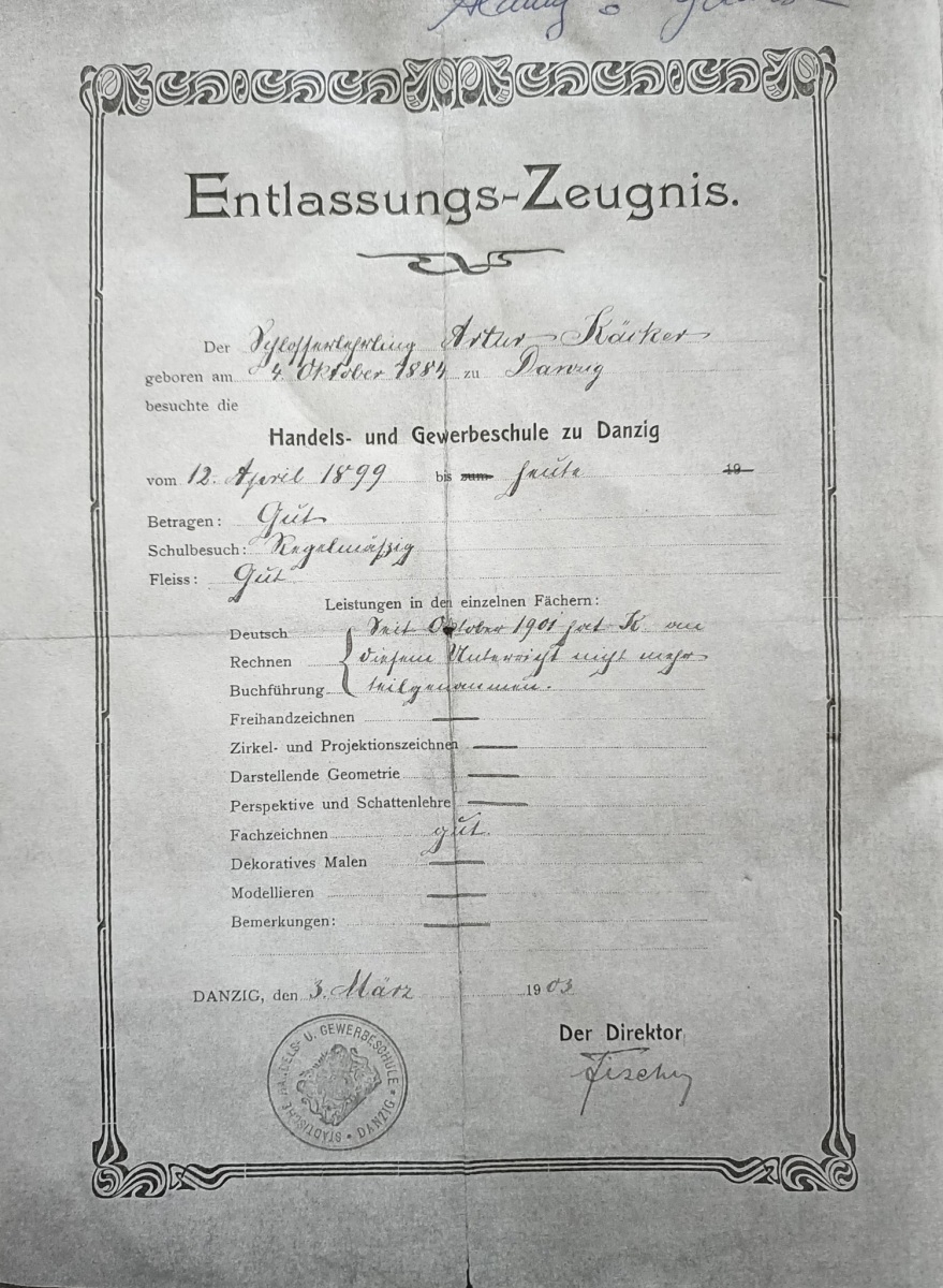 Artur Käcker urodził się 4 października 1884 r. w Gdańsku. W okresie od 12 kwietnia 1899 r. do 3 marca 1903 r. uczęszczał do Szkoły Handlowej i Rzemieślniczej w Gdańsku, którą ukończył w zawodzie ślusarza (patrz-świadectwo ukończenia szkoły). Następnie rozpoczął karierę wojskową. Od 1.10.1909 r. do 31.01.1910 już w stopniu sierżanta 2 Kompanii 21. Pułku Piechoty ukończył pomyślnie szkolenie na urządzeniach telegraficznych Twierdzy Toruń (obsługa telegrafu i radiostacji). Potwierdza to opinia służbowa z 4 kwietnia 1913 r.
