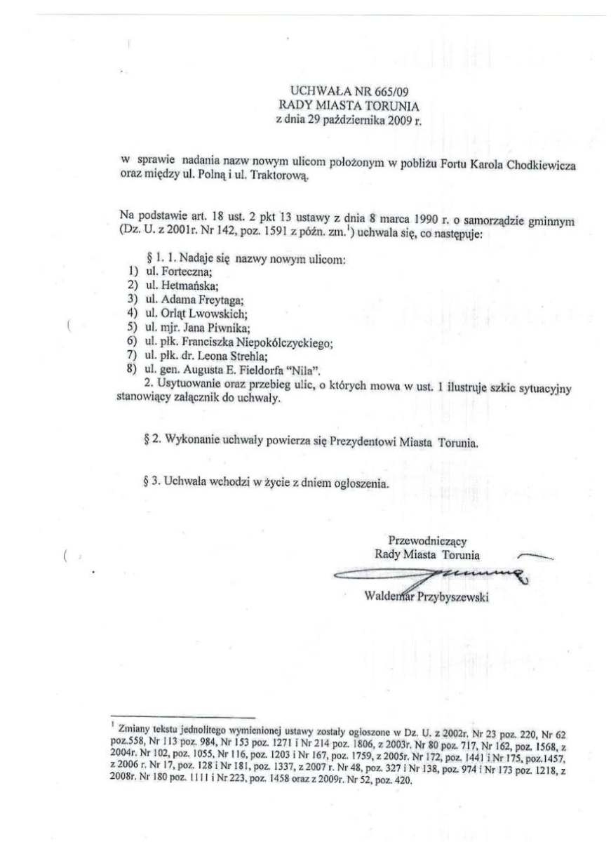 Jesteśmy dumni z bohaterów, którzy walczyli za naszą wolność. Szczególnie bliscy naszym sercom są związani z Toruniem Cichociemni, których sylwetki i dokonania przedstawialiśmy tu wielokrotnie i których groby otaczamy opieką. Tym bardziej przykro, że szacunku i uznania dla zasług polskich patriotów nie widać w sposobie ich upamiętnienia w nazwach toruńskich ulic. 7 lipca 2025 roku na stronie naszego Muzeum wspominaliśmy sylwetkę ppłk. dypl. Stanisława Sędziaka ps. ”Warta”, który od 2010 roku jest patronem ulicy na lewobrzeżu – niestety – na tabliczkach z nazwą ulicy pominięto jego imię i stopień. Uchwała Rady Miasta nie uwzględniła wysokiego stopnia wojskowego bohatera, którego imieniem szczyci się nawet Zachodniopomorska Brygada Obrony Terytorialnej w Szczecinie. Brak tego istotnego elementu jest zapewne tylko niedopatrzeniem, który można nadrobić, wszak inicjatywa uchwałodawcza przysługuje miejskim radnym, prezydentowi, a wreszcie nam – mieszkańcom. Ulica Sędziaka nie jest jedynym niechlubnym przypadkiem. Między ulicami Polną i Traktorową znajdują się ulice Augusta E. Fieldorfa ps. „Nil” i Leona Strehla (bez stopni wojskowych i naukowych). Pierwszy z nich był generałem brygady, drugi pułkownikiem i doktorem medycyny. Co istotne, w uchwale 665/09 RM Torunia widnieje zapis o nadaniu ulicom nazw gen. Augusta E. Fieldorfa „Nila” i płk. dr. Leona Strehla. Dlaczego stopni zabrakło na tabliczkach – nie potrafimy zrozumieć. Trzeba przyznać, że nie jest to wyłącznie specyfika naszego miasta. W Brodnicy uchwałą Rady Miasta nr XIX/230/96 z 20 czerwca 1996 r. jednej z ulic nadano nazwę Maksymiliana Klinickiego zaś tabliczka informuje o ulicy Klinickiego. Nie dość, że na tablicy pominięto imię pochodzącego z Brodnicy Cichociemnego, to w uchwale RM nie uwzględniono jego stopnia wojskowego. Podobnie w Chełmży: w spisie ulic widnieje ulica Mieczysława Szczepańskiego, zaś na tabliczkach M. Szczepańskiego. Patronem tej ulicy jest oczywiście kpt. art. Mieczysław Szczepański, uczeń miejscowego gimnazjum, Cichociemny, stracony pod fałszywymi zarzutami wyrokiem sądu wojskowego w kwietniu 1945 r. Dla wszystkich osób związanych z mundurem, może dla cywili mniej, bezspornym jest fakt, że wysoki stopień wojskowy jest uhonorowaniem wieloletnich zasług i przedmiotem dumy, zupełnie niezrozumiałe jest zatem, dlaczego i Toruń, i sąsiednie miasta na tabliczkach ulicznych stopnie wojskowe traktują po macoszemu…
