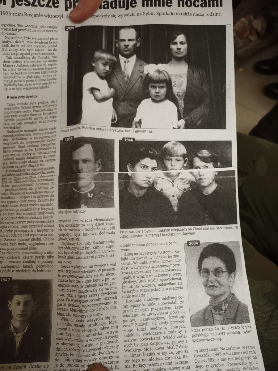 Rodzina Maciejewskich mieszkała przed wojną na Kresach Wschodnich Rzeczypospolitej w Wielkim Możejkowie, powiat Szczuczyn Nowogródzki. Ojciec Antoni, legionista, uczestnik wojny polsko-bolszewickiej, odznaczony Krzyżem Walecznych, pracował jako leśniczy. Po zajęciu tych ziem polskich przez Armię Czerwoną we wrześniu 1939 r. ukrywał się. Został aresztowany przez NKWD, osadzony w więzieniu, a następnie zesłany na Syberię. W dniu 10 lutego 1940 r. NKWD przyszło po jego rodzinę. Nasz rozmówca z matką i starszym rodzeństwem trafił do obozu pracy w Obłasti Nowosybirskiej, w którym pozyskiwano żywicę z drzew. W 1942 roku dotarł do rodziny ojciec, lecz wkrótce zmarł. Brat Jerzego – Zygmunt dostał się do armii generała Władysława Andersa. Walczył we Włoszech i zginął w wieku 20 lat pod Monte Cassino 17 maja 1944 r., na jeden dzień przed zdobyciem klasztoru. Uszczuplona przez los rodzina Maciejewskich wróciła z dalekiej Syberii do Polski w 1946 roku…